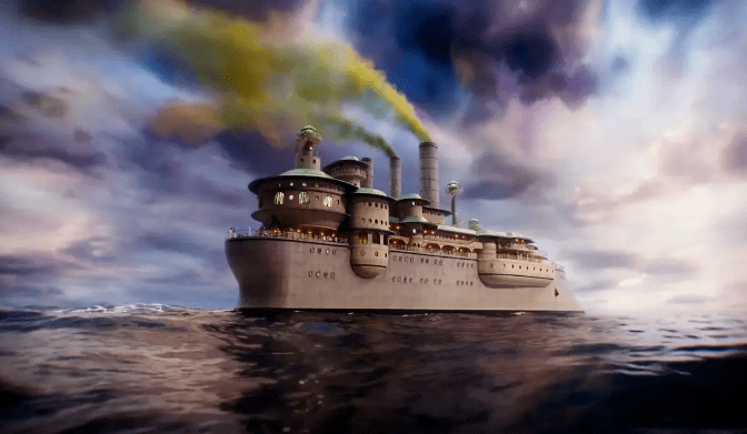 这里包括了戈德温实验室的表现主义科幻风格;一艘豪华客船,就像一个古董玩具,内部装饰得极端奢华;还有一座超凡脱俗的亚历山大酒店,一座从海岸线一直爬升到云端的城堡。摄影师罗比-瑞恩的镜头捕捉到了这一切,他对色彩和光线的关注是近乎神奇的,当然,其中也少不了兰斯莫斯对鱼眼镜头的嗜好。