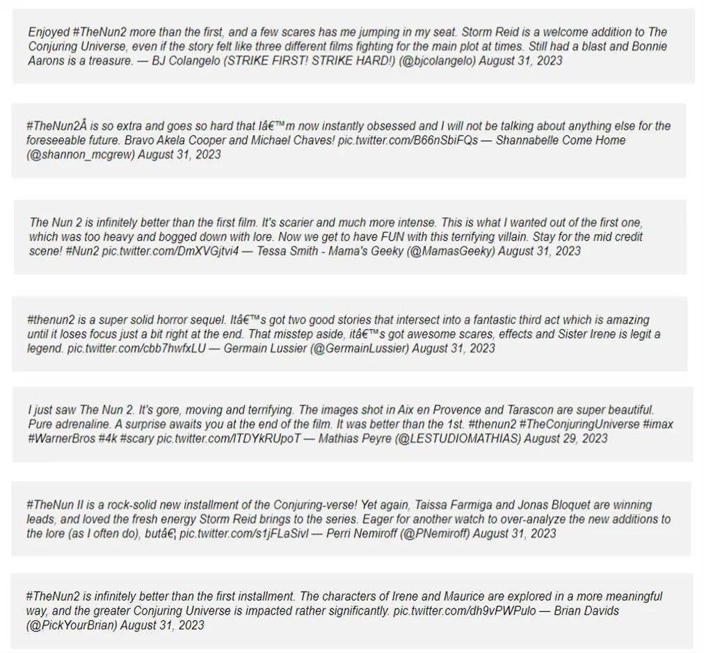 《鬼修女2》的前期评价已经出炉,基本上所有的评价都表示,无论惊吓点还是剧情上,比第一部要强,具体评价就不翻译了。