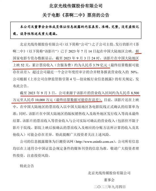 根据公告显示,截至2023年9月3日24时,该影片在中国大陆地区上映52天,累计票房收入(含服务费)约人民币3.79亿元,公司源于该影片的票房收入区间约为人民币8500万元至10000万元。
