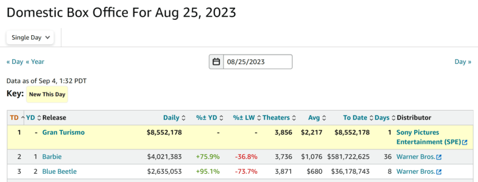 另据《综艺》杂志报道,在索尼将《GT赛车》的公映日期从11号推迟两周后,其间举行了多轮点映并产出约390万美元,这笔票房被索尼合并算到影片的开画数字中,但这一做法招致华纳兄弟不满,后者声称单以周末计《芭比》才是冠军。
