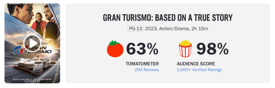 从口碑来看,《GT赛车》的烂番茄新鲜度为61%,主流媒体表示其基于事实的故事讲述稍显松散,但总体上不失为一部扎实的赛车电影;而《GT赛车》的爆米花指数更达到98%,足见原游戏粉丝对此次改编持肯定态度。另外《GT赛车》在IMDb上得到7.4分(共1.4万个评价),将为后市提供一定势能。