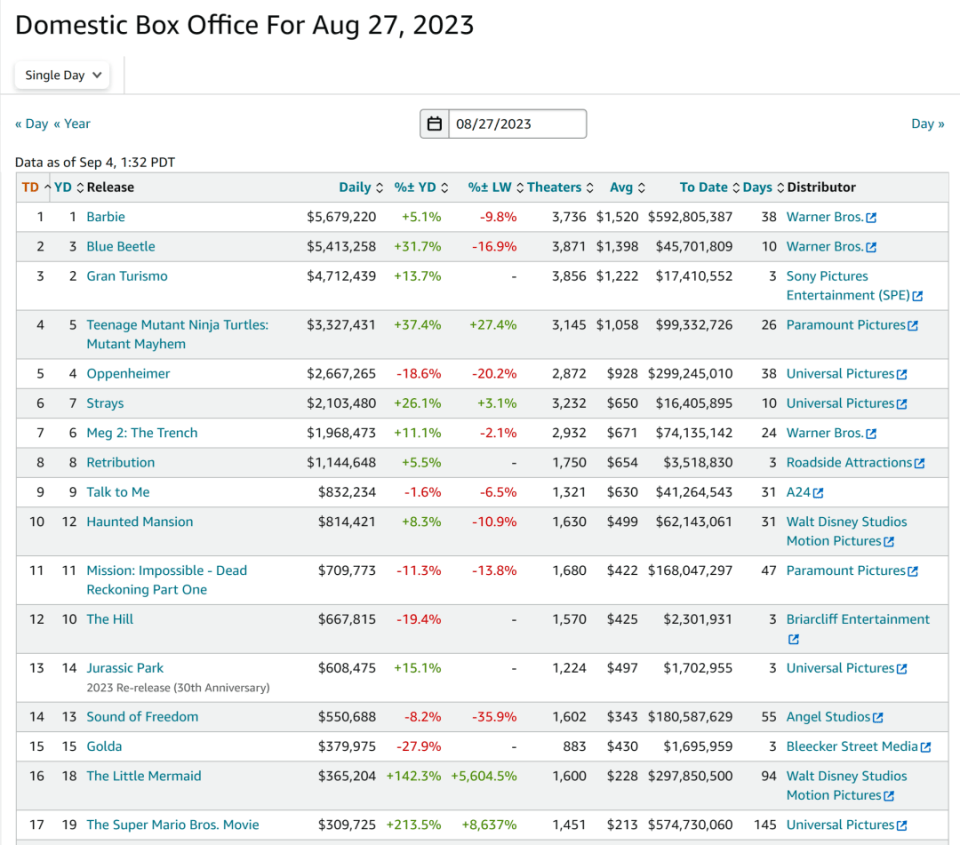 若对不同类型做区分,“影院日”的助推效应也有相当差异。重新扩映的《小美人鱼》和《超级马力欧兄弟大电影》环比至少翻番,《忍者神龟:变种大乱斗》、《蓝甲虫》和《流浪狗》也上浮两至三成,成为增量客流到场的最大受益者。而《GT赛车》和《巨齿鲨2:深渊》的涨幅也达到两位数,稳守头名的《芭比》则微升5.1%。