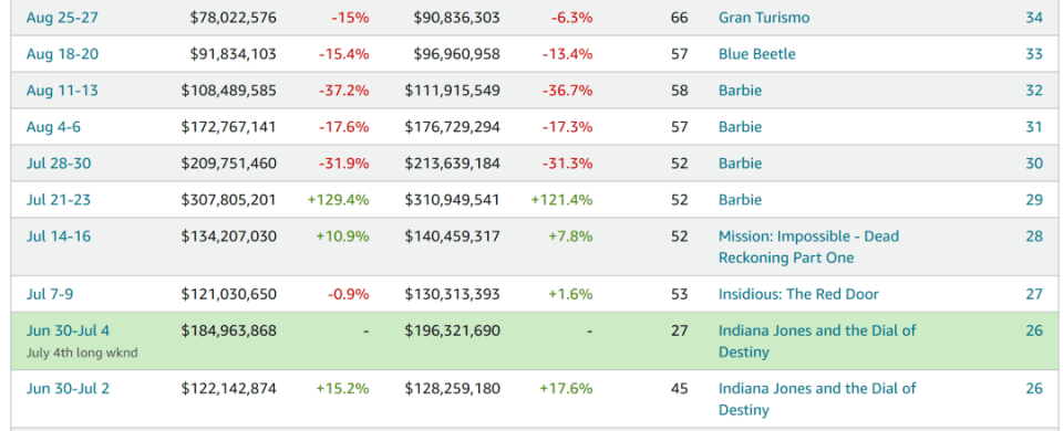 相比之下,《奥本海默》和《碟中谍7》双双下滑逾10个百分点,为前十名中受创最深的影片。总体而言,偏向家庭或年轻观众的电影获益更明显,而定位成人和大龄群体的影片反倒被分流。