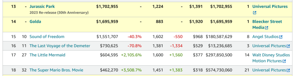 值得一提的是,《侏罗纪公园》在公映30周年之际重返大银幕,在1224家影院拿到170万美元,压过海伦·米伦领衔的《歌尔达》,双双进入票房榜前15名;瞄准为“影院日”而来的家庭客流,《小美人鱼》和《超级马力欧兄弟大电影》分别扩增1560家和1383家影院,周末票房也大涨约21倍和35倍,比预估时公布的18倍和21倍尤有提升,累计则迫近2.98亿和5.75亿美元。