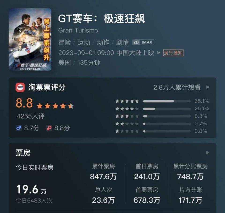 在新片中,受益于“影院日”当天的增量客流,《GT赛车:极速狂飙》(以下简称《GT赛车》 )首周末斩获1741万美元,成为索尼年内第三部开画登顶的电影。