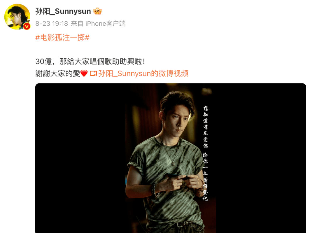 因饰演阿才圈粉无数的孙阳终于在30亿票房时带来一首粤语歌,并和粉丝相约一起向“40亿前进”!