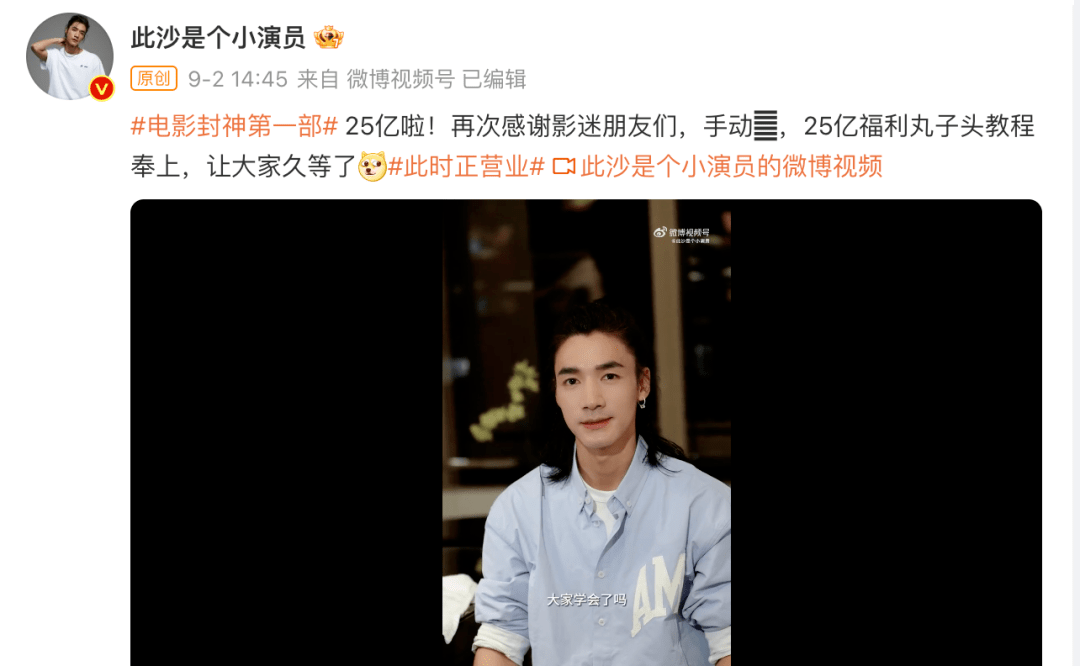 9月2日,随着《封神第一部》票房突破25亿,演员此沙兑现承诺带来了粉丝期待已久的“丸子头”教程。