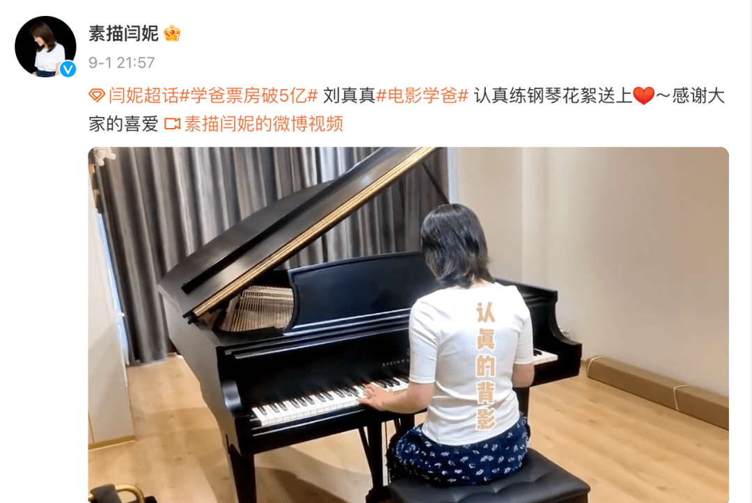 饰演鸡娃群主的闫妮在戏外“鸡”起了自己,带来”刘真真的钢琴首秀“。网友评论:技术不够,诚意来凑,仿佛看到了练琴的自己。