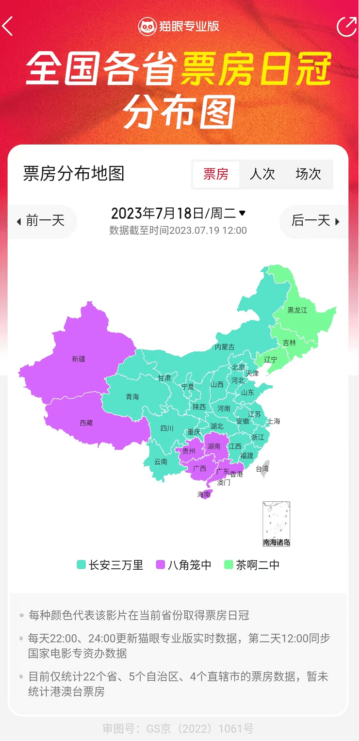 显然,今年暑期档,多数影片的主流消费群都高于大盘均值,这也反映出,在与市场对接的过程中,影片内容差异与不同性别、地区的市场匹配度,正借助宣发愈渐精准地影响票房转化。伴随着行业对市场细分、定向发行的需求增长,猫眼专业版上线票房日冠地图,不同影片优势地区的票房透明化,为区域的差异化排片提供参考依据。