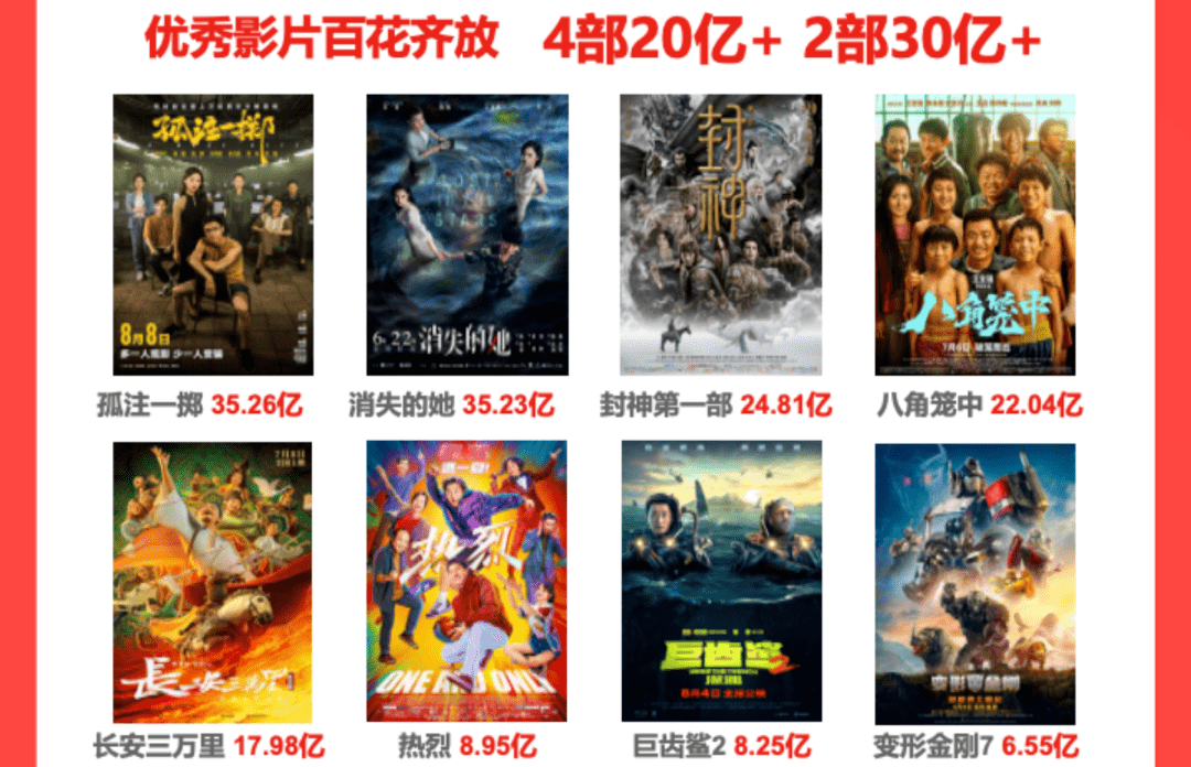 高企的票房得益于多部强势的内容支撑,档期内先后走出《消失的她》《八角笼中》《封神第一部》《孤注一掷》四部票房达20亿量级的作品,其中,《消失的她》《孤注一掷》累计票房逐步攀升至35亿以上。