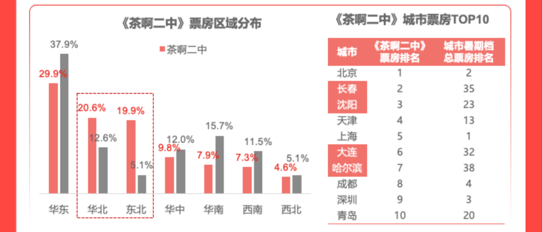 一个典型的例子是,今年暑期档,《茶啊二中》带着鲜明的地域特征走进市场,与其关联度更强的长春、沈阳、大连等东北、华北地区呈现出更强的消费积极性,也成为拉升影片票房主力消费区。