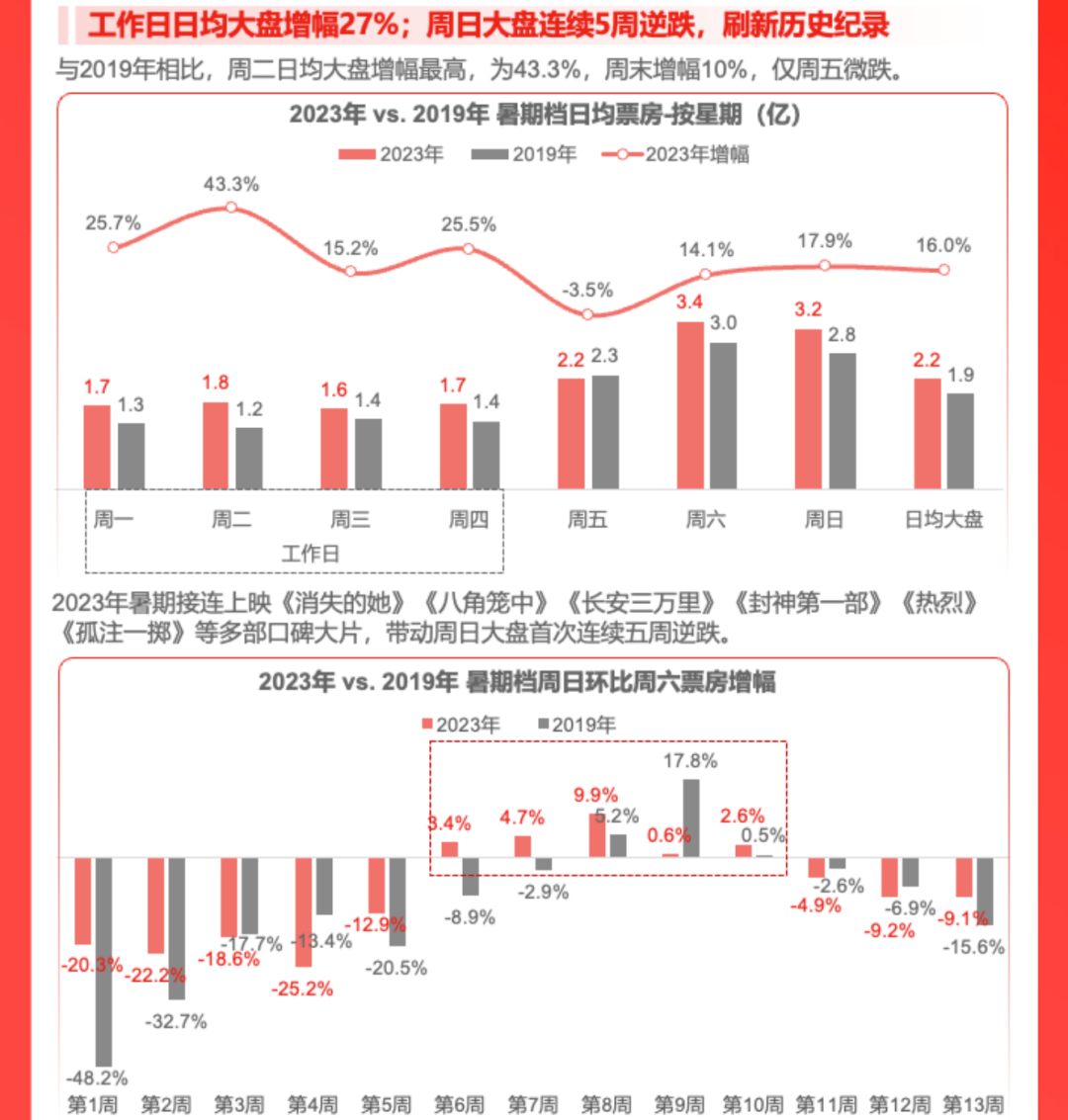 受此带动,档期内不只工作日大盘日均票房明显优于往年同期,周末大盘票房也多次出现逆增长。《报告》数据显示,今年暑期档第6周至第10周,连续5周周日大盘都实现票房逆跌,其中逆跌幅度最大达到17.8%。