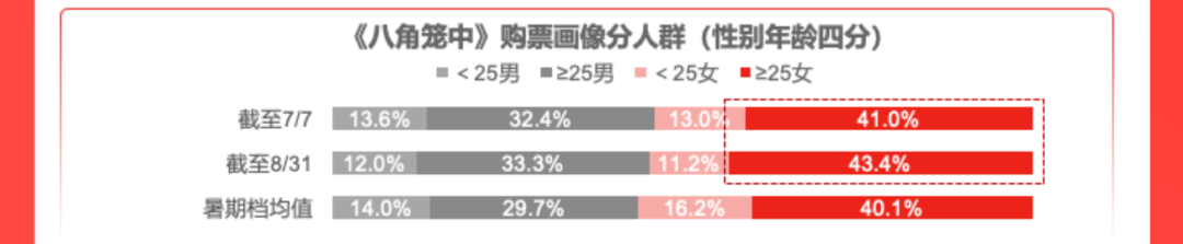 其中,《八角笼中》便是经过早期试映,基于市场反馈在影片剪辑逻辑、叙事节奏等方面做出调整。同时,影片的质朴、真诚迅速击中下沉市场和亲子市场,试映数据导向下,《八角笼中》围绕定向市场开启大规模点映。伴随着更多观影数据产生,猫眼AI大数据经过多项指标对比,发现“儿童”、“真实故事”能够有效激发女性观众共情,影片随之快速调整宣发走向,吸引更多潜在消费群走进影院。《报告》数据显示,《八角笼中》上映前后,25岁以上的女性群体增长更为明显。