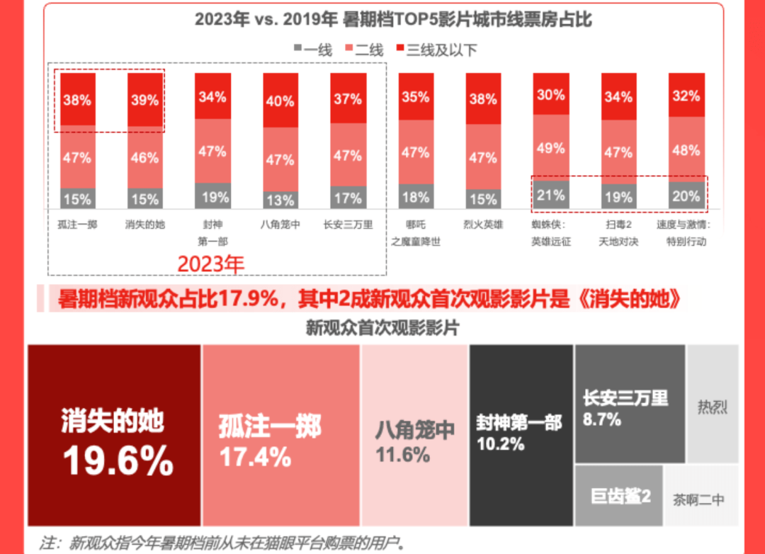 同时,猫眼等主流互联网宣发平台,对市场差异化需求的捕捉更加敏锐,平台服务体系带来的精准转化加速消费市场扩容。直观的表现是,今年暑期档影片的下沉程度进一步拉升,市场渗透范围持续扩大,更多新消费群体走进影院。《报告》数据显示,档期内,此前从未在猫眼购票的新观众占比达到17.9%。多元内容与长效宣发合力之下,今年暑期档画上了一个完满的句号。