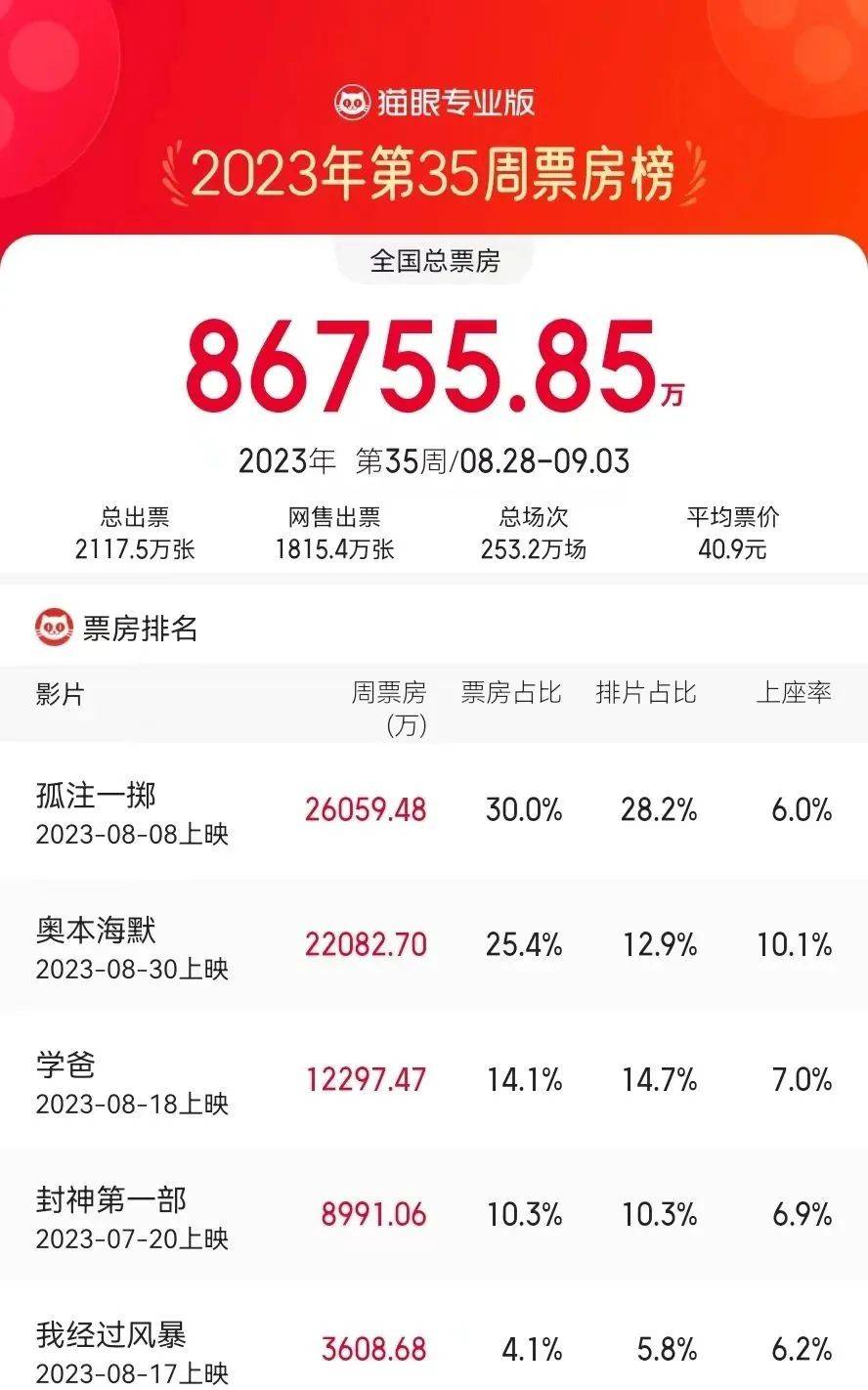 《孤注一掷》第四周进账2.6亿持续稳坐周票房冠军位。上映28天,累计票房36.44亿,已超《消失的她》,跃居中国影史票房总榜第三位。