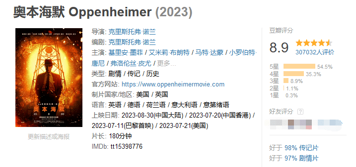 影片延续诺兰形式化风格以及对宏大戏剧性主题的偏好,以非线性叙事展示美国知名理论物理学家、“原子弹之父”奥本海默充满起伏的一生和复杂人格。