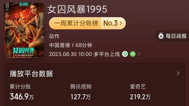 时隔36年,又有一部港片《女囚风暴1995》,打着女版“监狱风云”的旗号,上线6天,累计分账346..9万。