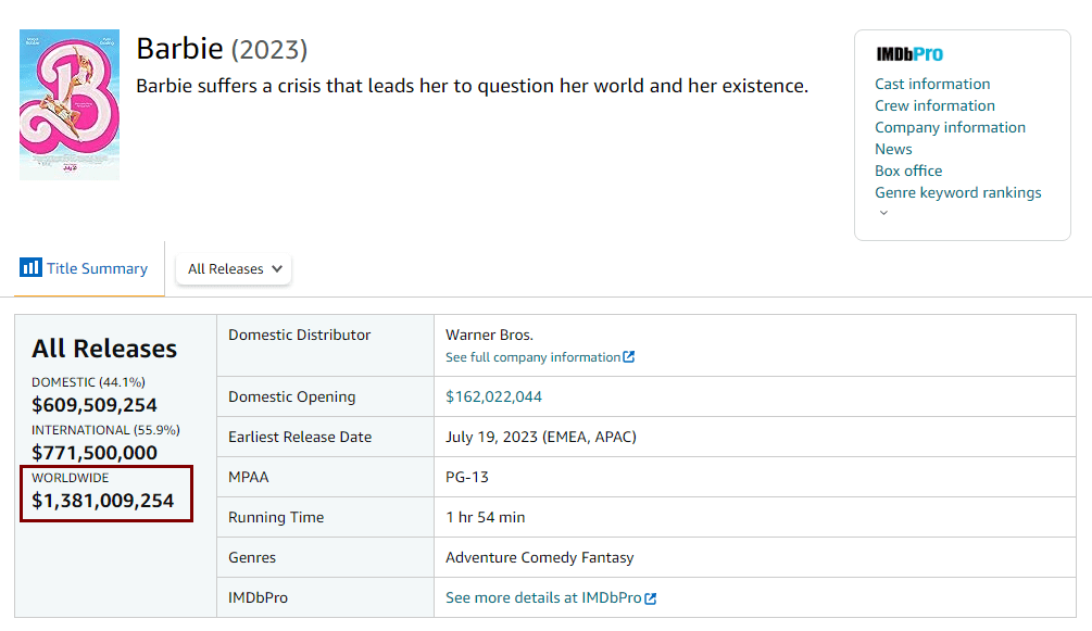 原标题:《芭比》累计13.81亿美元登顶2023年全球票房榜 暂居今年单片票房冠军