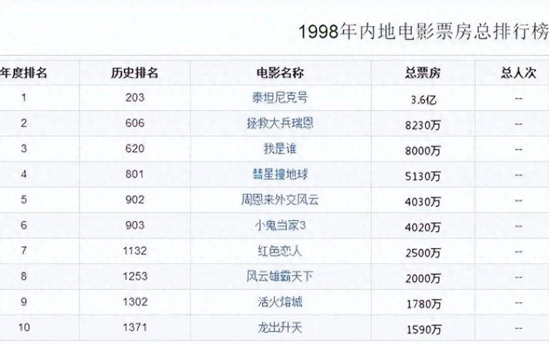 内地电影票房前三名有两部好莱坞大片,分别是《泰坦尼克号》和《拯救大兵瑞恩》,成龙的《我是谁》只能屈居第三名。
