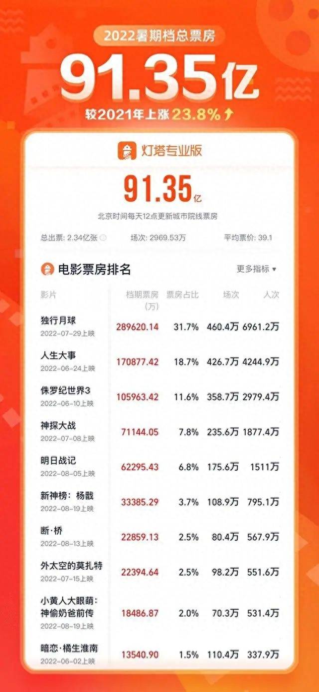 2022年暑期档票房前十榜单,好莱坞电影同样只剩2部,票房占比仅有13.6%。