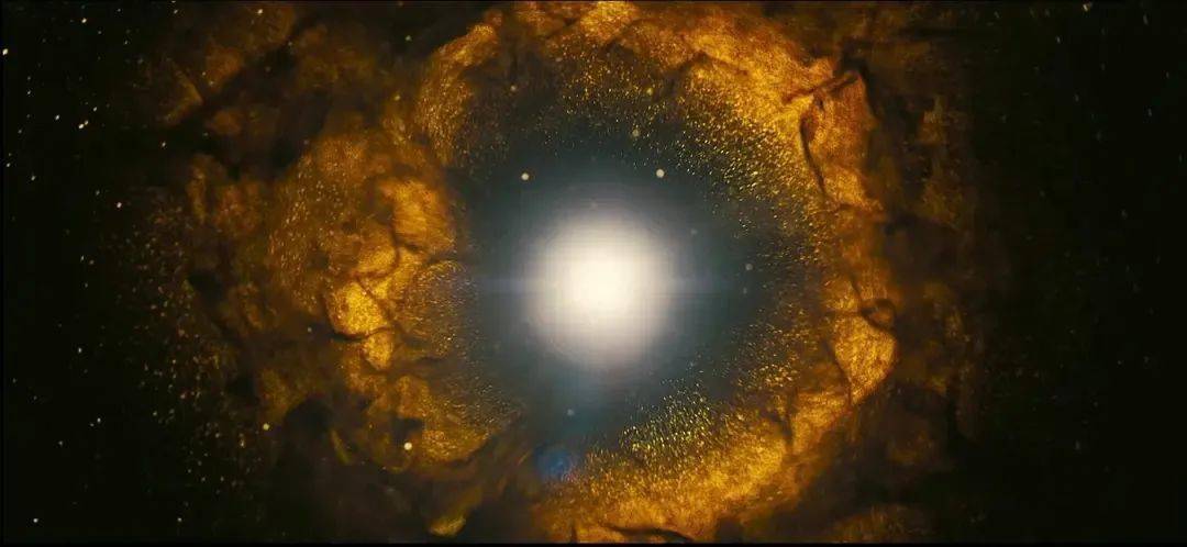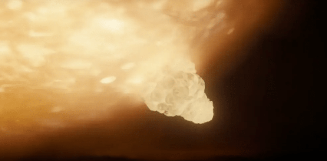 影片中,随着巨大蘑菇云的腾空而起,一道足以令人暂时失明的亮光照亮了黑夜。戴着护目镜的奥本海默趴在掩体后面久久凝视。