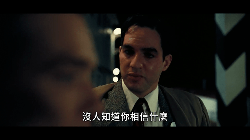 于是,一个镜头平移,刚刚还西装革履的奥本海默,变得全身赤裸面对着审讯他的众人。