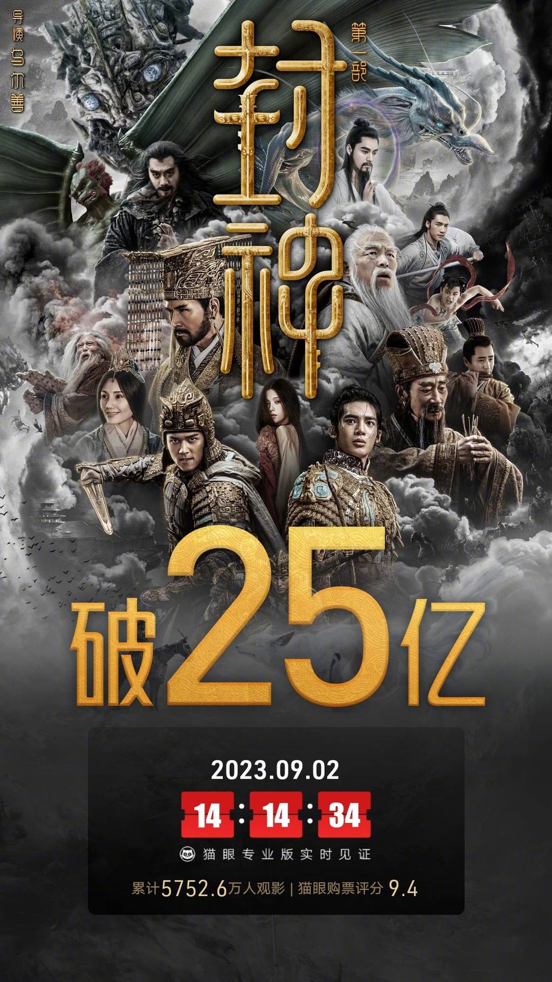 搜狐娱乐讯 据猫眼专业版数据,截至9月2日14:14,乌尔善 执导,费翔、黄渤、于适、陈牧驰、娜然等主演的#电影封神第一部#上映第45天,累计票房突破25亿,累计观影人次5752.6万,暂居2023年内地电影票房榜第五位。