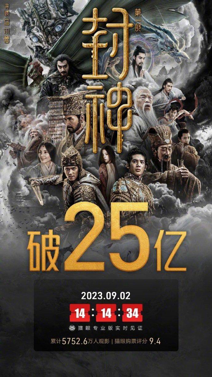 搜狐娱乐讯 据猫眼专业版数据,截止9月2日14时14分34秒,电影《封神第一部》上映45天,总票房破25亿。