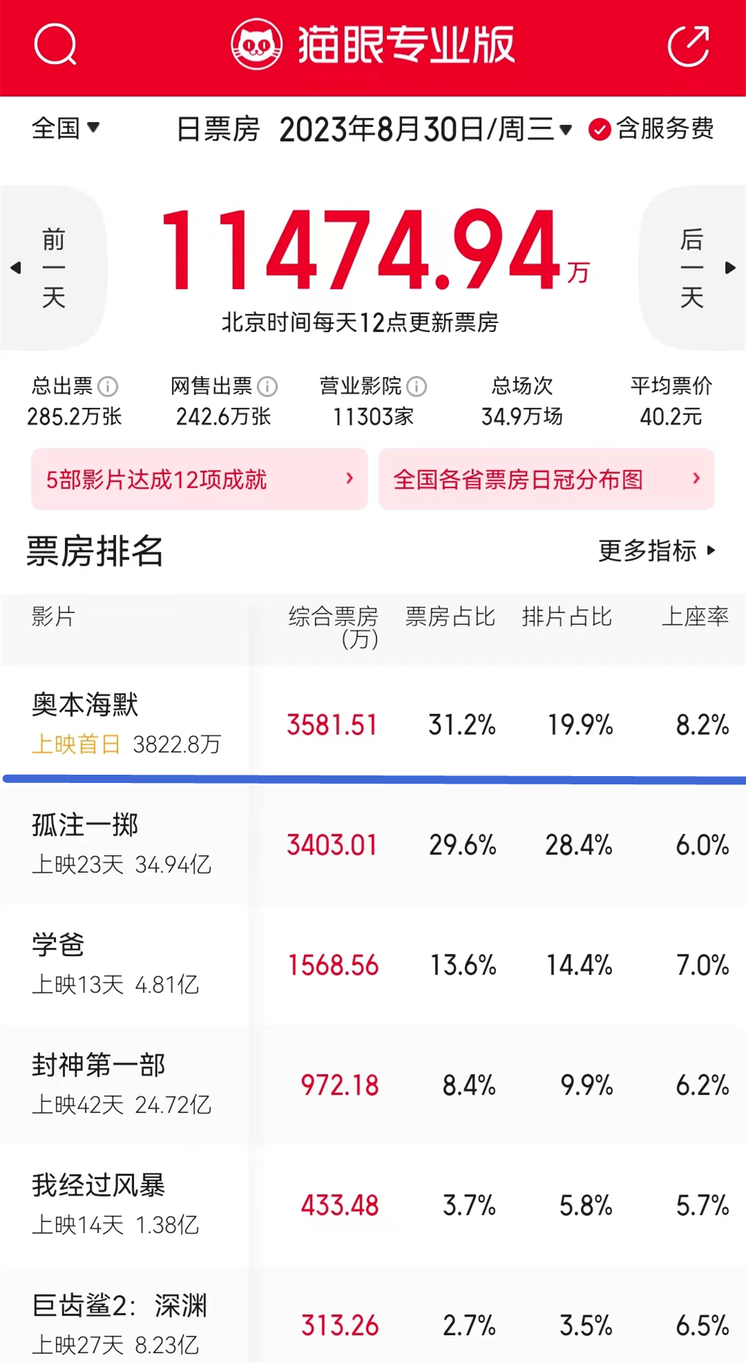 尽管“3小时时长”“全是文戏”“纯人物传记片”“角色众多”“对话密集”“大量物理知识”“穿插故事线”“IMAX票价过百”等劝退元素已经被铺天盖地地告知给观众,但克里斯托弗·诺兰的新片《奥本海默》依然在晚于北美5周,且工作日首映的不利条件下,终结了《孤注一掷》对单日票房榜首的连庄。