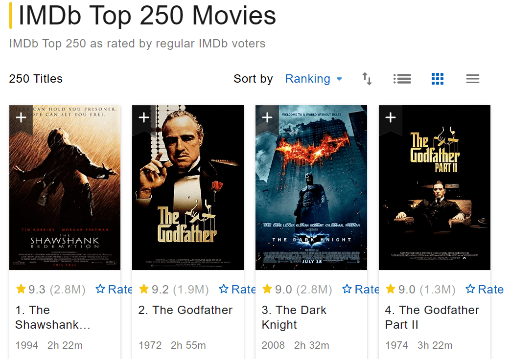 IMDb全称为Internet Movie Database,是隶属于亚马逊公司旗下的互联网电影资料库。该网站的核心价值是在线资料库,附带一个供全球网友打分的系统。根据网友的综合打分,会实时更新榜单“IMDb Top 250”。