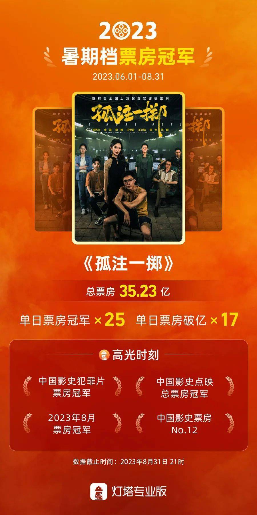 两部影片票房破35亿,《孤注一掷》更是在暑期档最后一天,以微弱成绩反超《消失的她》,问鼎暑期档单片冠军。