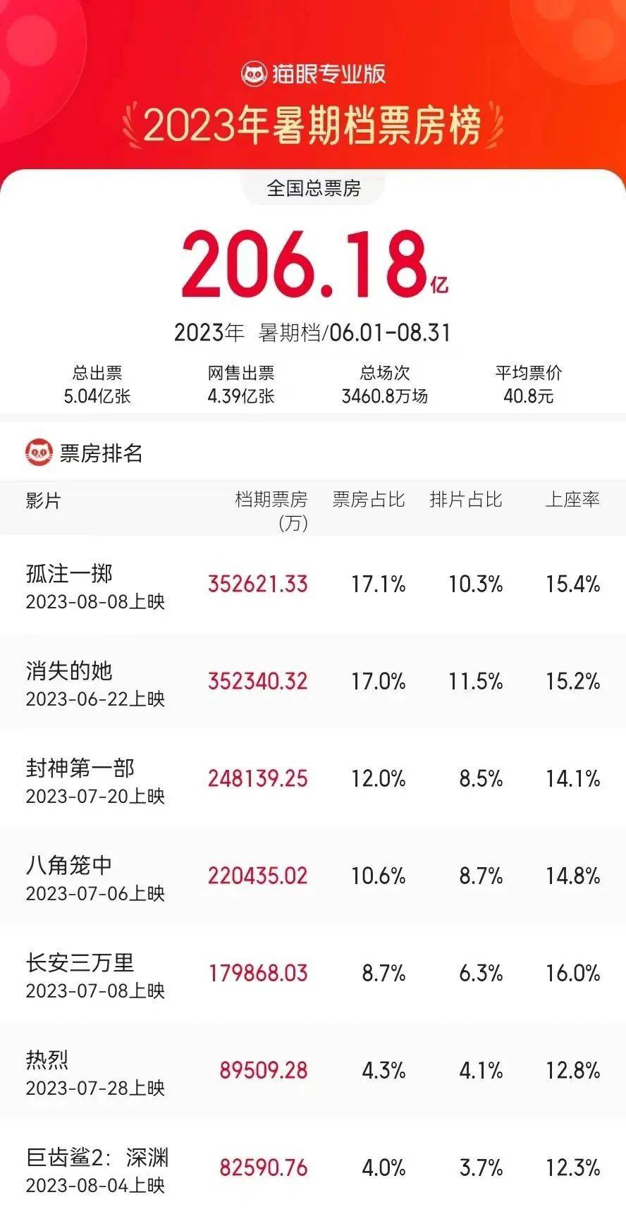狂揽206亿 票房的2023暑期档超预期了完成任务,带领今年度内地电影总票房闯过了400亿大关,是疫情后的最快、最好成绩。