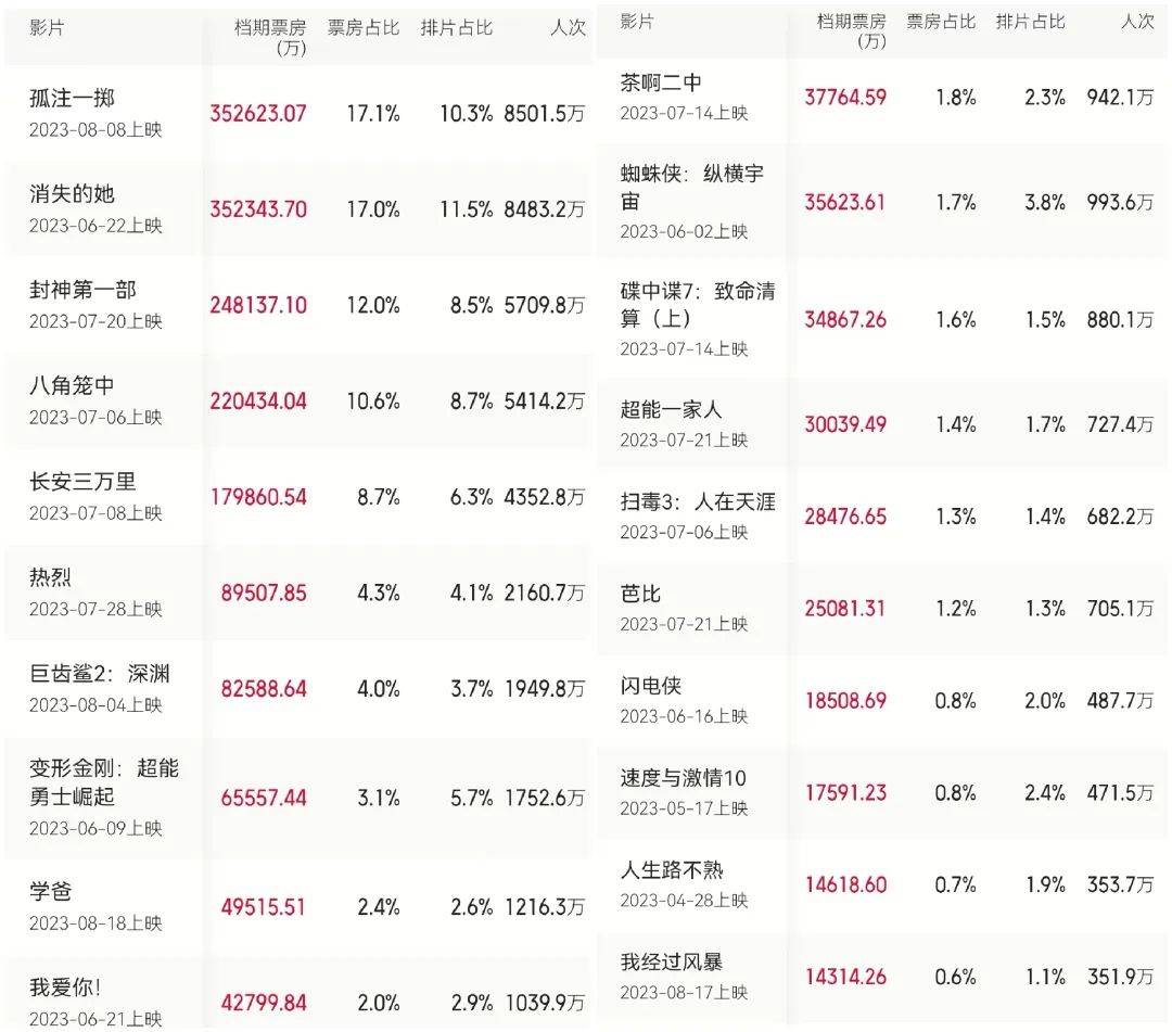 而且,自6月下旬端午档《消失的她》以爆款黑马之姿票房疯涨开始,到七月的《八角笼中》《长安三万里》《封神第一部》,再到8月领跑的《孤注一掷》,基本上每周都能涌现出一部品质不差、话题热度高的影片,打造出了罕见的热片接力跑——