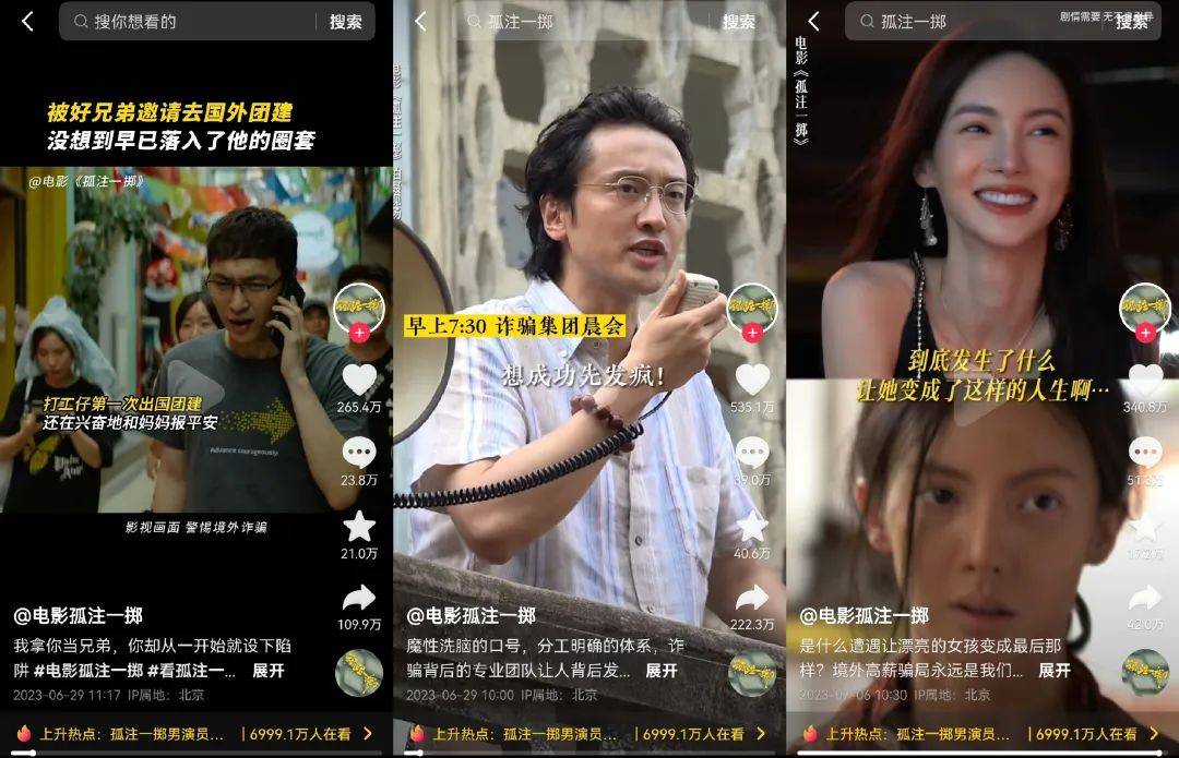 两片在短视频平台铺天盖地的下沉营销,抓准了影片与话题直接相关的猎奇看点。诈骗园区如何虐待折磨受害者,东南亚旅游的迷药和人彘如何可怕等病毒式传播的爆款短视频,勾起了大批路人群体的好奇心,吸引观众持续进场,带动票房节节高升。