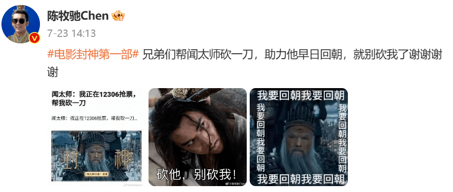 好在后来,片方开始在微博传播“质子团肌肉男”、以及基于片尾彩蛋的“砍一刀助力闻太师回朝”等热梗,这才让《封神》在第二周起迎来了爆发(上映第10天时单日票房达1.6亿)。