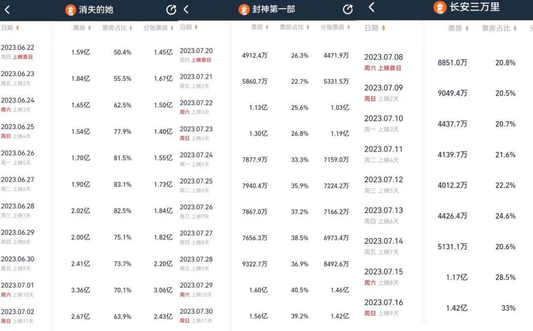 而今年则是慢慢发酵,前期的口碑不温不火也能在后期的引导下好转,票房常在第二周起缓缓起势,工作日票房逆跌成为暑期档热门片的常态,典型如《封神第一部》和《长安三万里》。
