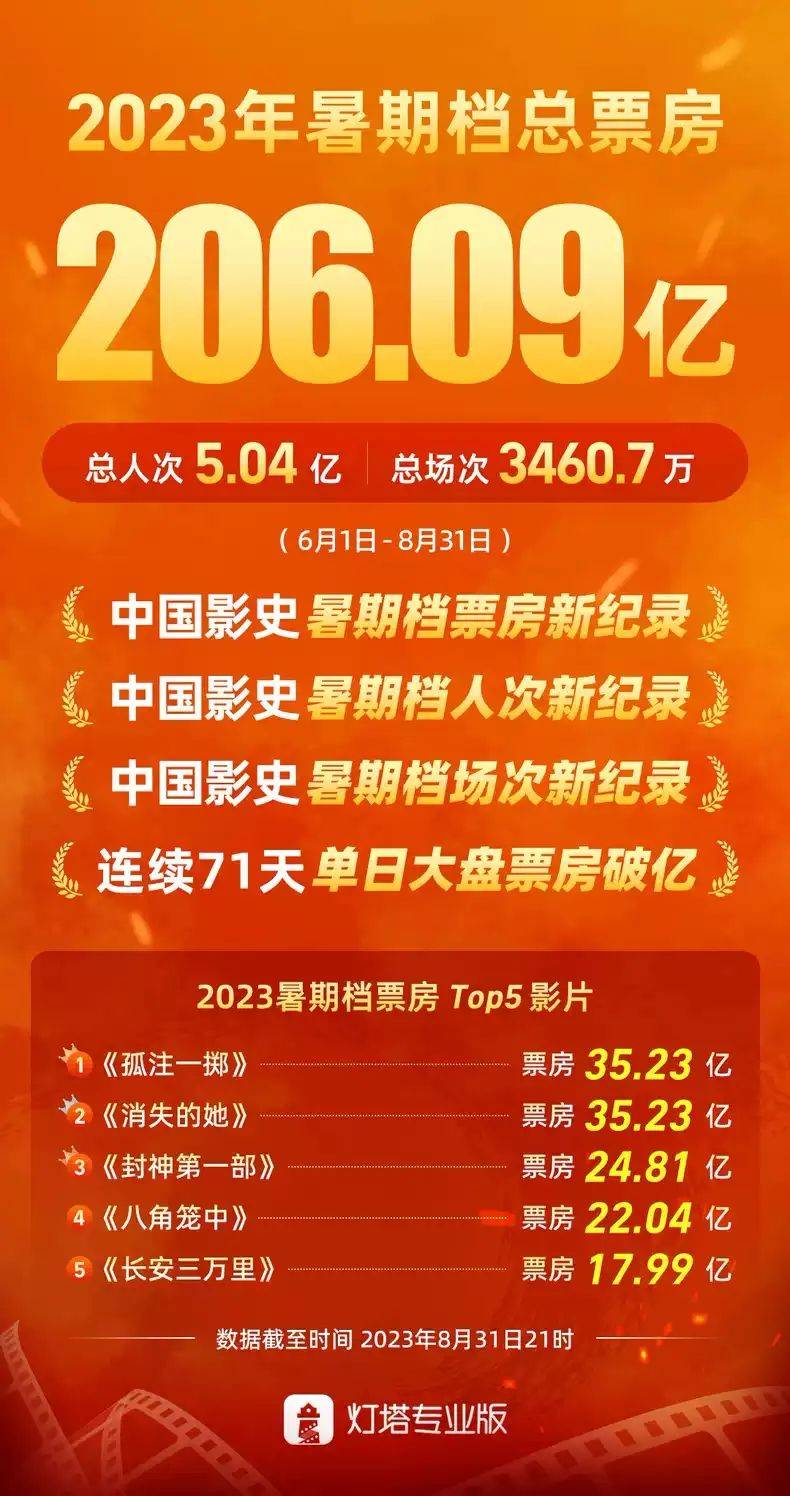 爆发力远超预期的2023年暑期档,最终以创中国影史暑期档纪录的206亿元票房(观影人次破5亿)落下帷幕。