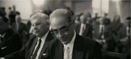 第二场听证会则是黑白画面,呈现了在后来成为对手的前原子能委员会主席刘易斯·施特劳斯(由小罗伯特·唐尼饰演)的角色。