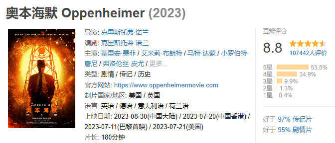 月末,诺兰新片《奥本海默》刚刚登陆内地院线。