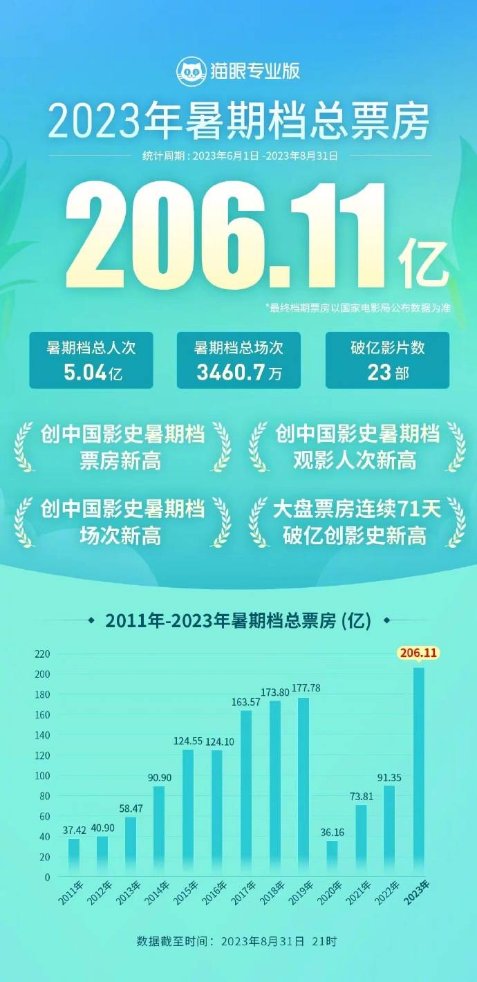 原标题:2023暑期档内地总票房达206.17亿刷新纪录 《孤注一掷》小胜《消失的她》夺冠