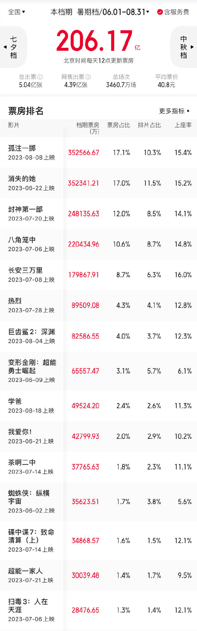 2023暑期档票房Top10↓↓