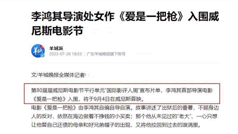 由李鸿其自编自导的《爱是一把枪》,则因“充满新意、生猛而活力满满”进入“国际影评人周”单元。虽然这是他首次当导演,但其对电影风格和细节的把握,却让单元主席比阿特丽斯·佛罗伦萨不吝赞美。