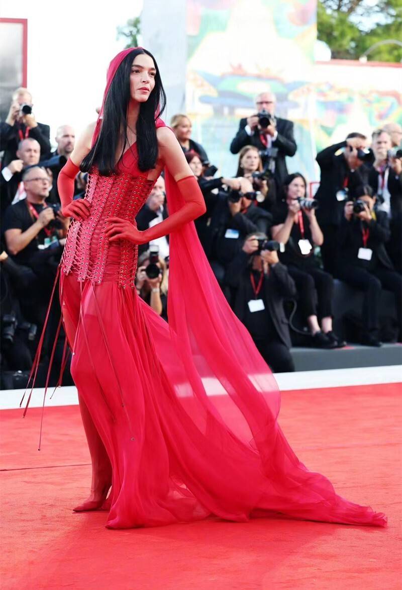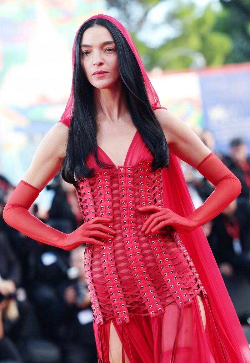 玛莉亚卡波·波高诺的“系带束腰”式红纱裙,性感和飘逸倒是都有了,但就是莫名像从某密的现场穿过来的,全靠她的好身材和气质才撑住。