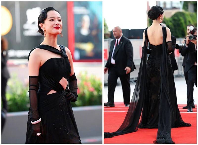 有短片入围的李梦,同样选择了黑色。只是跟舒淇的裙子比,她这条飘带、镂空加同色花饰的礼服,设计是真有点乱,有点在飘逸和累赘之间左右横跳的感觉。