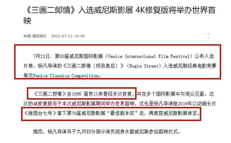 于1995年上映,由杨凡执导的《三画二郎情》(又名《妖街皇后》)的4K修复版,入选了经典电影竞赛单元;已故中国导演万玛才旦执导并编剧,以“人与动物”为故事核心的《雪豹》,将在非竞赛展映单元首映。