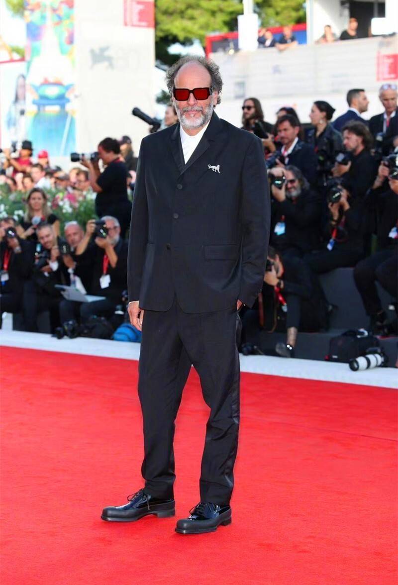 导演卢卡·瓜达尼诺一身中规中矩的黑色西服套装,但抢镜的深红色黑框眼镜,却透露了他内心的随性不羁。