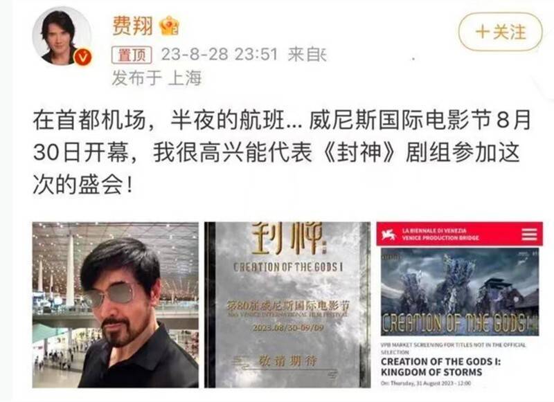 这部已在国内收获近25亿票房的中国神话大片,将在电影节上“把中国故事,讲给世界听”。费翔作为片方代表,已于28日乘机飞往威尼斯。