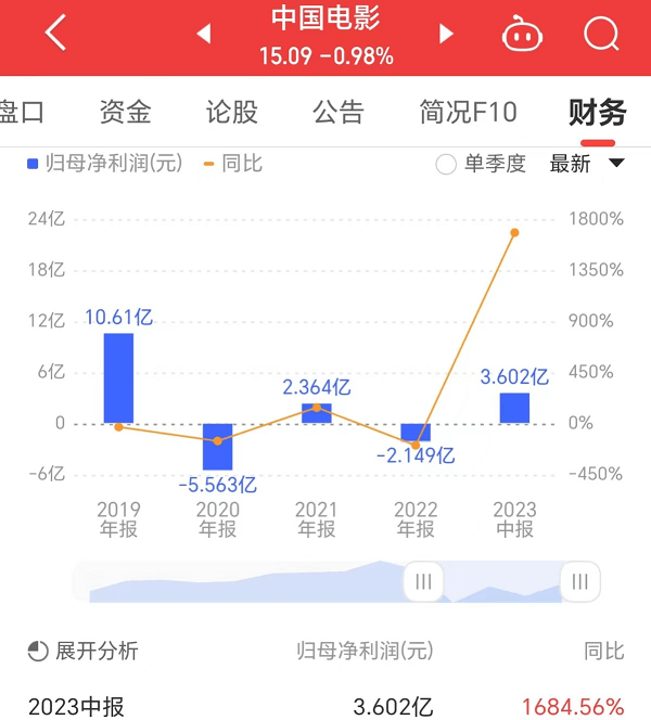 电影投资、发行、放映、科技、服务等多业务均衡发展的中国电影上半年净利润3.6亿元,同比暴增1685%,是三年疫情后的最好成绩,恢复到了2019年约53%的水平。