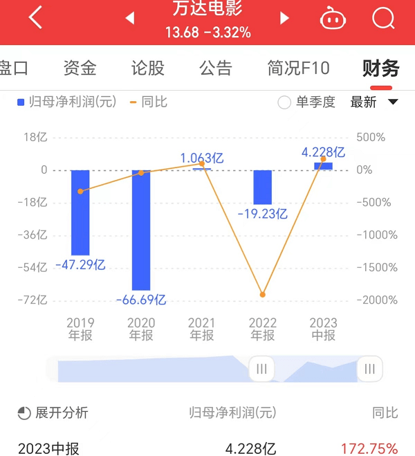 拥有全国第一大院线的万达电影上半年净利润4.23亿元,同比增长173%。