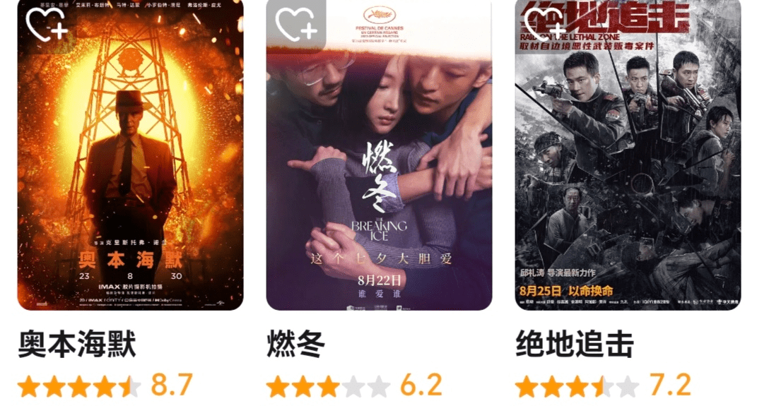 不过,《奥本海默》口碑很好,热度也更高,该片在大众购票及评分平台猫眼、淘票票分别得分9.5分、9.6分,在影迷聚集的豆瓣得分8.7分。首日上座率、场均人次均排在第一,第二日(周六)预售票房也高居第一。